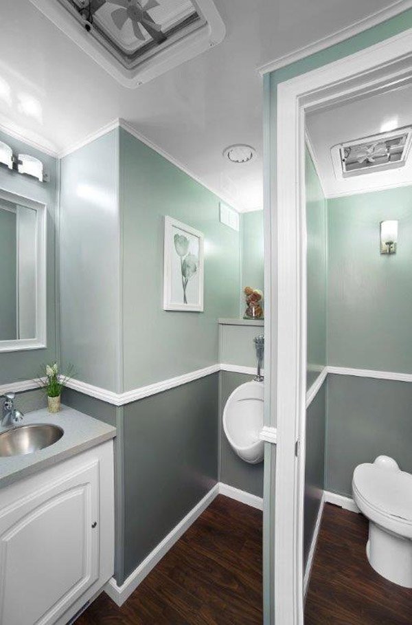 Our four-stall restroom trailer is perfect for larger weddings, corporate events, and remodels. We offer two different floor plans. One is a multi-stall unit featuring two exterior entries (male and female), with two toilet stalls and a sink/vanity on the female side and a toilet stall, a urinal, and a sink/vanity on the male side.  The other floor plan features four private stalls with exterior entrances.  All four stalls feature a toilet and sink/vanity.